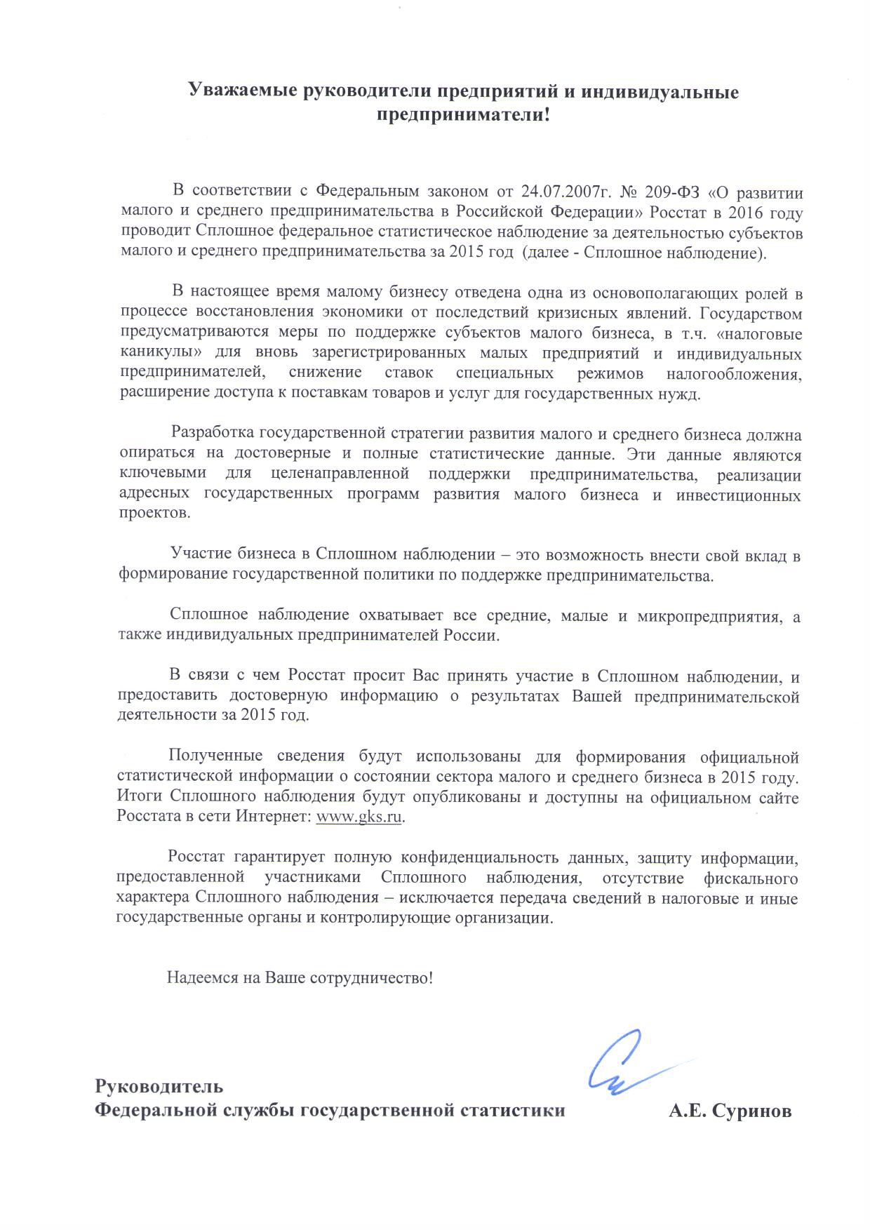 В соответствии с Федеральным законом от 24.07.2007г. № 209-ФЗ «О развитии малого и среднего предпринимательства в Российской Федерации» Росстат в 2016 году проводит Сплошное федеральное статистическое наблюдение за деятельностью субъектов малого и среднего предпринимательства за 2015 год (далее - Сплошное наблюдение).