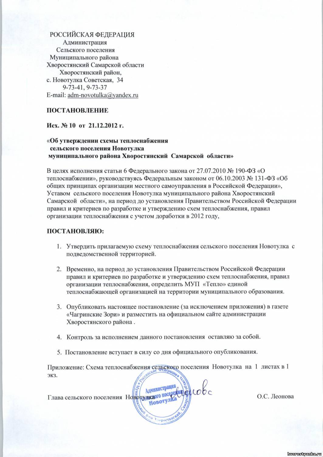 Постановление об утверждении графика по разработке и утверждения схемы теплоснабжения сельского поселения Новотулка
